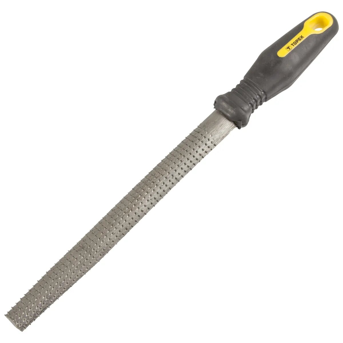Уникальная форма полукруглого напильника TOPEX обеспечивает максимальное качество шлифовки дерева. Крупнозернистая рабочая поверхность инструмента имеет длину 200 мм, она изготовлена из стали Т12, устойчивой к повышенным нагрузкам в процессе обработки пород. Чёрно-жёлтая резиновая ручка имеет выраженный противоскользящий эффект и эргономичную форму, благодаря которой напильником удобно работать. Напильник-рашпиль пригодится и в профессиональной мастерской, и в быту, он весит всего 0,17 кг, имеет специальное отверстие на рукоятке.